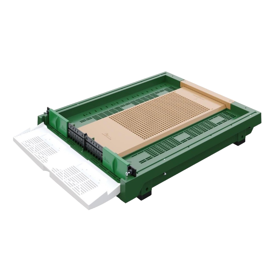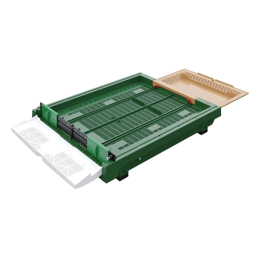 Önden Erişilebilir Çekmece Sistemi: Polen ve Varroa çekmecesi kovanın ön kısmında yer alır. Bu ergonomik tasarım, dar alanlardaki arılıklarda bile hızlı ve zahmetsiz bir kullanım sunar.